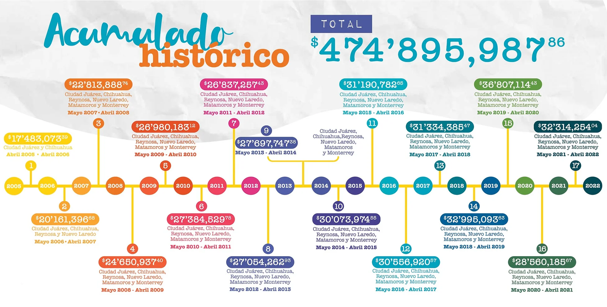 El 01 de abril del 2005 se dio inicio en Ciudad Juárez, el programa de redondeo "ayuda con tu cambio" y desde el 2007 se encuentra vigente en todas nuestras plazas (Ciudad Juárez, Chihuahua, Reynosa, Nuevo Laredo, Nuevo León y Matamoros).